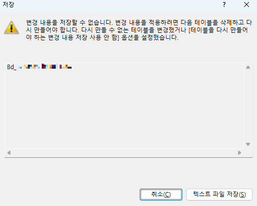 - 테이블을 다시 만들어야 하는 변경 내용 저장 안 함 체크 해제